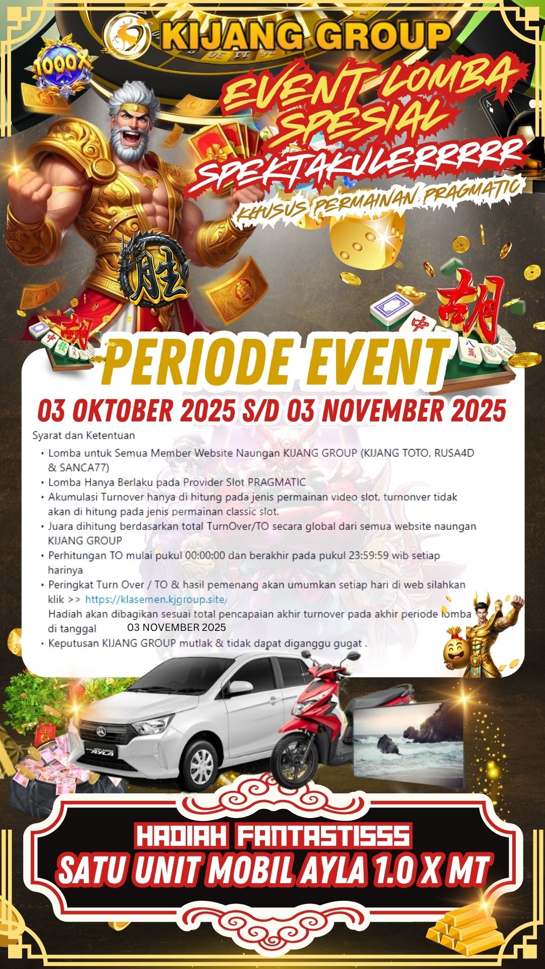 HADIR KEMBALI EVENT LOMBA SLOT PRAGMATIC SPESIAL PERSEMBAHAN DARI KIJANG GROUP DENGAN HADIAH YG MEMUKAU, RAIH KESEMPATAN UNTUK MENDAPATKAN HADIAH FANTASTIS SATU UNIT MOBIL AYLA 1.0 X MT